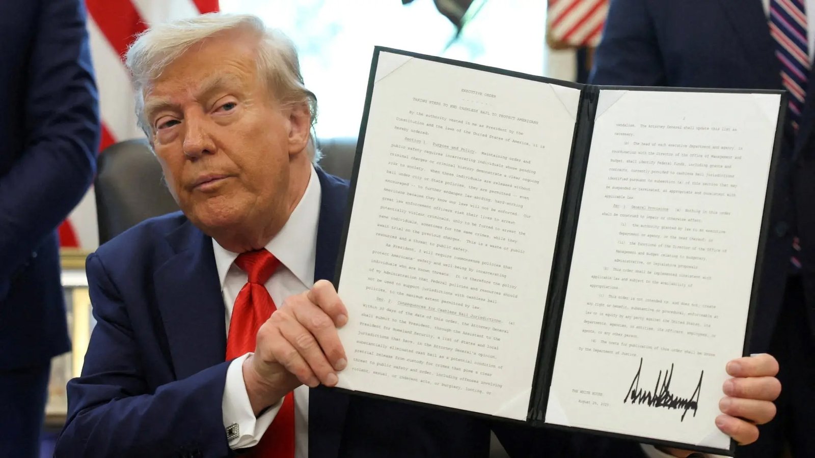 El presidente Trump firmó dos órdenes ejecutivas hoy, la Oficina Oval. Se trata de una medida para eliminar la fianza sin efectivo y así impedir que los sospechosos de algún delito sean puestos en libertad bajo fianza sin dinero en efectivo.